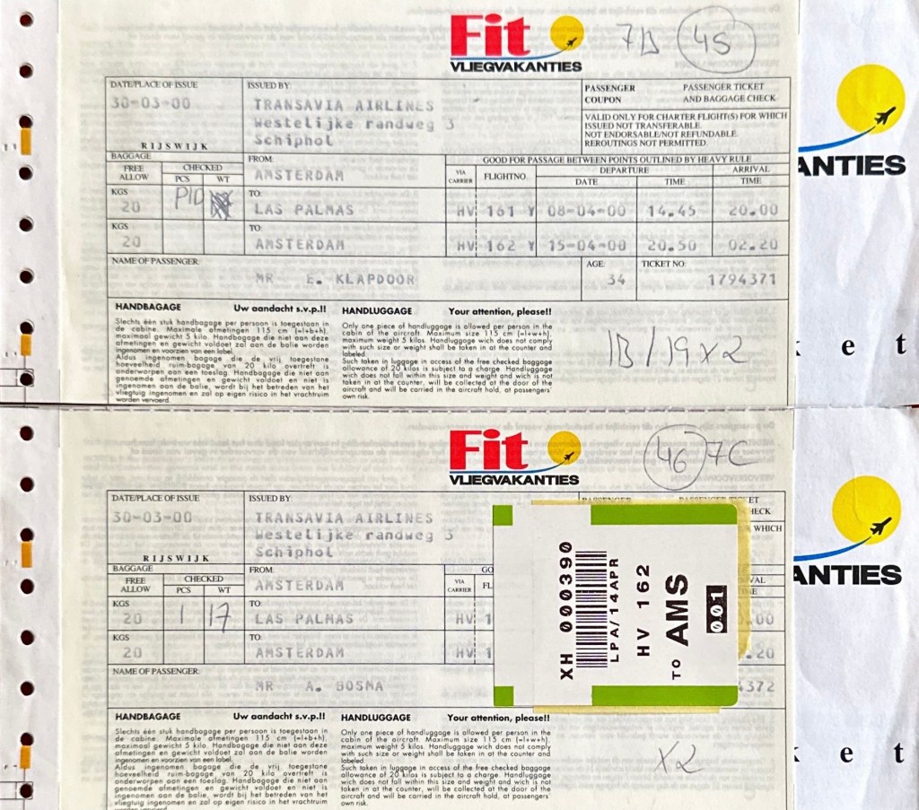 Wat ik me nog wel heel goed kan herinneren is dat ons vliegtuig naar thuis eerder aankwam dan gepland. Door stevige stormachtige wind kon het vliegtuig geen tussenstop op het eiland La Palma maken, waardoor de toeristen voor dit eiland op Gran Canaria moesten overnachten en wij in een bijna leeg vliegtuig terug naar Schiphol vlogen. Met veertien (14!) passagiers aan boord zijn we in een recordtijd (want stevige wind mee) naar Nederland gevlogen!