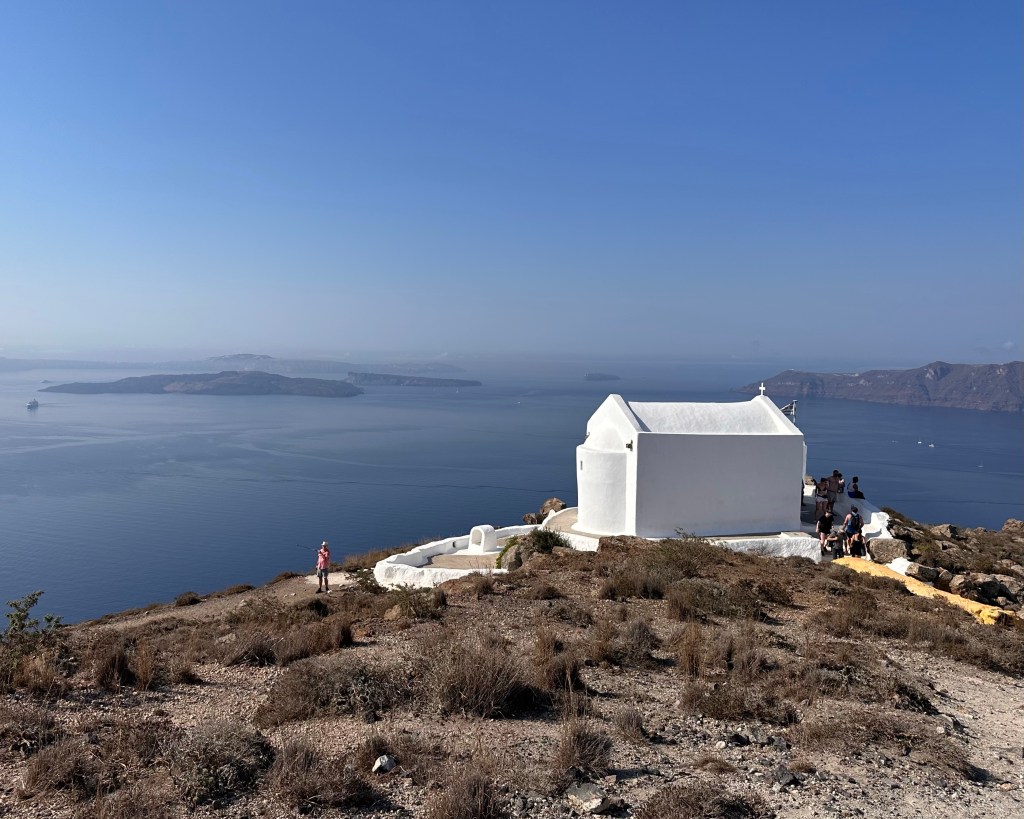 Onderweg kwamen we ook langs een paar pittoreske, witte kapelletjes, waar we op de heen- en terugweg even zijn gestopt om in de schaduw op adem te komen. Bij Tímíos Stavrós stonden vele toeristen als kamelen om een waterput bij te komen van de vele moeilijke en uitdagende stappen die op dit pad zijn achtergelaten. Thuis aangekomen hadden we 5,7 kilometer gewandeld.
