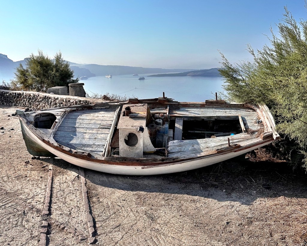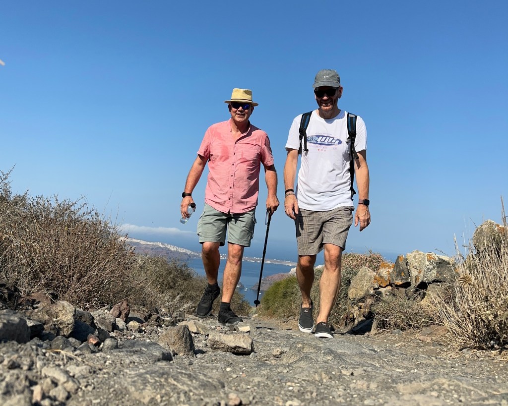 Na het ontbijt maakten we ons klaar voor een wandeling over een wandelpad, waarvan we gisteravond al hadden gelezen dat deze tot aan hoofdstad Fira liep, 10 kilometer verderop. In elk toeristisch vakantieboekje staat dit wandelpad beschreven. Het is een uitdagende route door een vulkaanlandschap; stevige schoenen zijn een must.