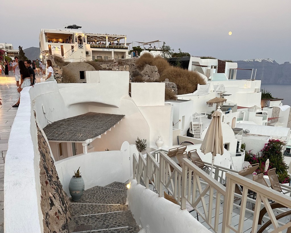 In de avond zijn we weer Oía ingelopen, waar vandaag wel heel veel toeristen in filevorming het stadje wilde binnengaan. Enkelen zullen de zonsondergang op hun mobiele telefoon gemist hebben. Morgen is er voor hen weer een kans. Ter afsluiting hebben we lekker gegeten bij Geogis Kokalis, een restaurant op steenworp afstand van ons verblijf. Nu nog een glaasje wijn en daarna naar bed. Er is nog geen vaste planning, maar morgen is er vast wel weer genoeg te doen.