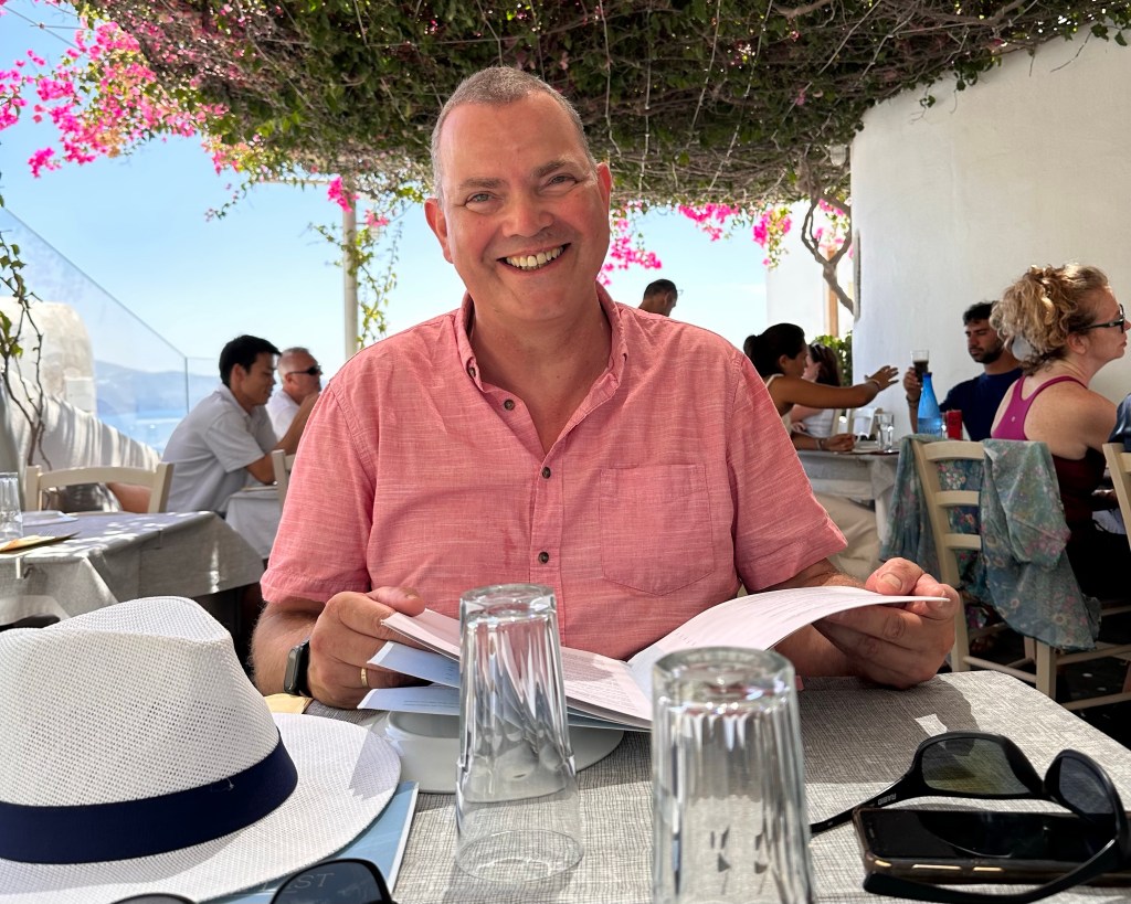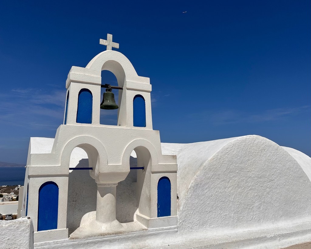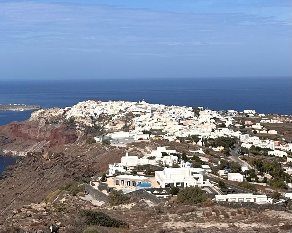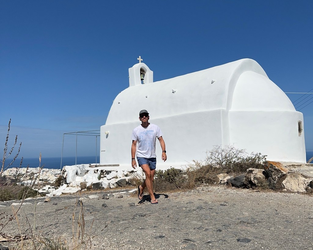 Na het ontbijt ben ik in m’n eentje even gaan wandelen op het zogenaamde salamanderpad. Niet het hele stuk zoals we een paar dagen geleden liepen, maar even een kilometer heen, en weer een kilometer terug. Dat vond ik voldoende met 28° celsius in de zon. Aangekomen bij het eerste witte kapelletje ben ik omgekeerd, richting thuis, en daar zijn we samen het zwembad in gedoken. In het water heb ik mijn dagelijkse 30 baantjes getrokken (volgens mijn horloge is dat 1,5 kilometer) en zijn we daarna het centrum van Oía ingegaan om te gaan lunchen.