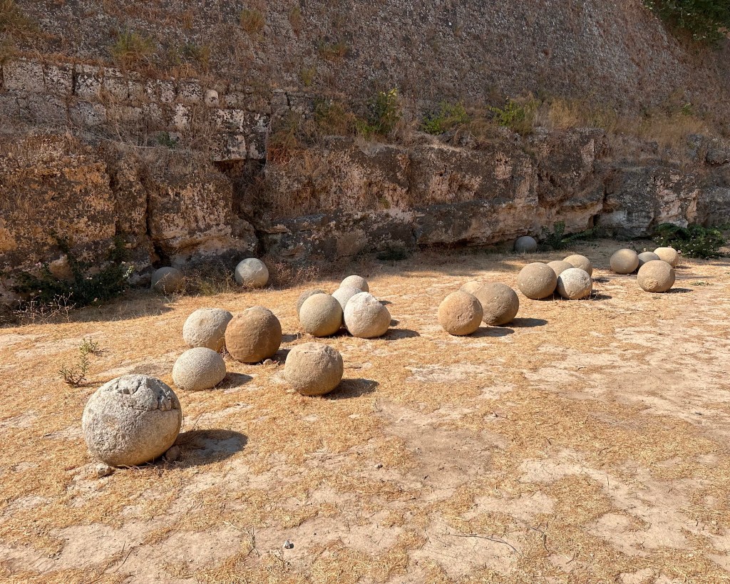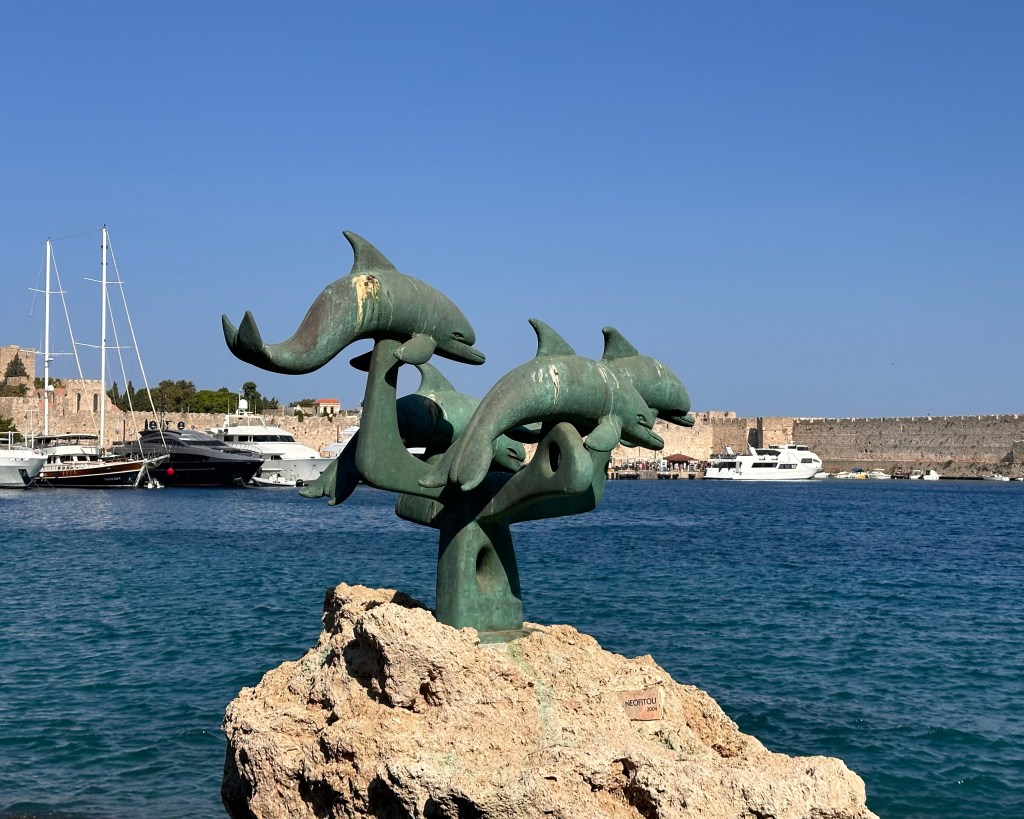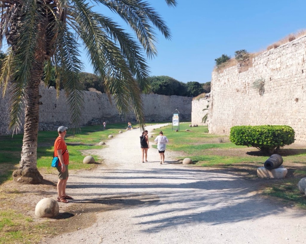 Na de wandeling zijn we in een lommerrijk parkje op een terras gaan zitten en hebben hier genoten van een ijskoude frappé. Hierna zijn we in het middeleeuws stadje gegaan om daar langs de vele toeristische winkeltjes te lopen. We hebben het een en ander kunnen scoren, waaronder een kerstbal van Rhodos (een andere vakantie-traditie). Het duurt tenslotte nog maar 112 dagen tot kerst. Edo heeft traditioneel weer een vlot hoedje gescoord.