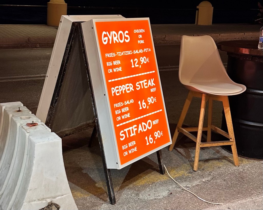 In de avond zijn we op zoek gegaan naar een leuk eettentje, die we uiteindelijk vonden aan de westkust van het eiland; Orexi. We zagen op het bord een aanbieding van pepper steak met friet en een pul bier voor een aardige prijs. Het bier was goed, de steak viel iets tegen; het waren dunne runderlapjes, maar de pepersaus was weer prima. Edo voelde zich vanavond niet helemaal lekker, dus zijn we op tijd naar ons tijdelijke thuis gegaan, waar hij het bed is ingedoken en ik nu dit stukje schrijf. Hopelijk voelen we ons morgenochtend weer helemaal fris, want dan hebben we een eiland te ontdekken!