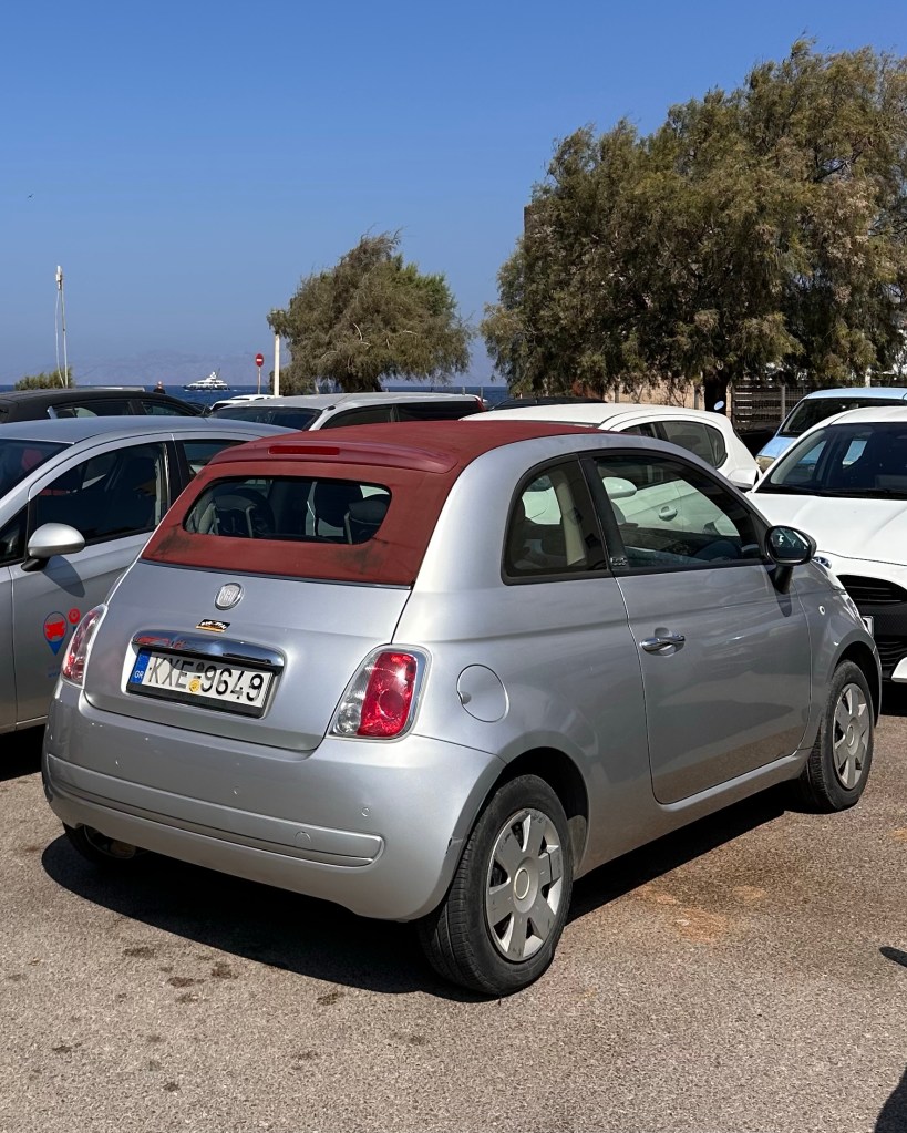 Vanmorgen werd om 08:00 de huurauto afgeleverd, een Fiat 500 cabrio. Zilvergrijs, met een bordeauxrood dak. Helemaal niet groot, maar hartstikke handig op een Grieks eiland als Rhodos. Na het ontbijt was het dan ook snel in de auto en richting de Vlindervallei te racen.