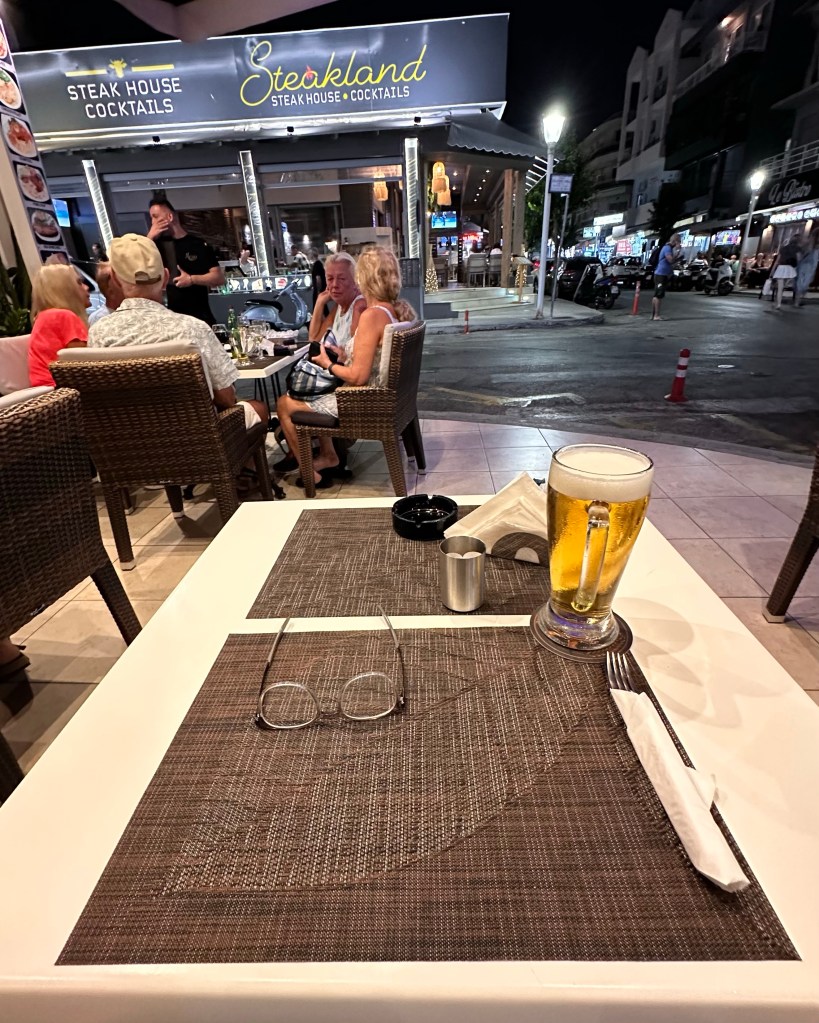 Na een korte rondwandeling heb ik bij Local gevraagd of ze een table for one hadden, en dat hebben ze positief beantwoord. Dus ben ik er gaan zitten voor een souvlaki met een large beer. Het was er gezellig druk, met hits uit de seventies, en tussen de rokende gasten. Alsof het even 1978 was. Het eten was er overigens prima. Hierna ben ik weer naar ons tijdelijke thuis gegaan.