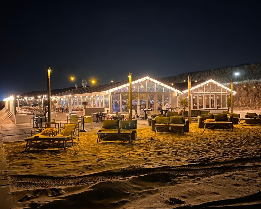 Nu we heerlijk hebben gegeten bij een beach club verderop, is het nu aangenaam vertoeven met een wit wijntje in de hand en uitzicht op een donkere nacht, waar in de verte aan de horizon de lichten van voorbijvarende schepen zijn te zien.