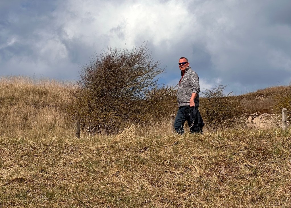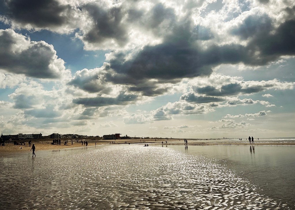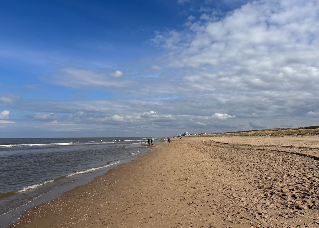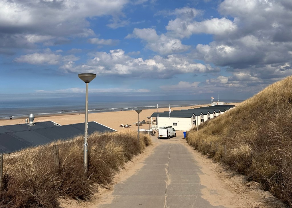 Met de zon en de wind in de rug zijn we in aangenaam tempo naar het noorden gelopen, om in Noordwijk om te keren en door de duinen weer terug te wandelen. Na een ruim anderhalf uur en zevenenhalf kilometer kwamen we weer aan bij ons tijdelijke thuis. De zon scheen fel, wanneer er geen wolk voor hing, dus hebben we heerlijk op onze strandbedjes gelegen.