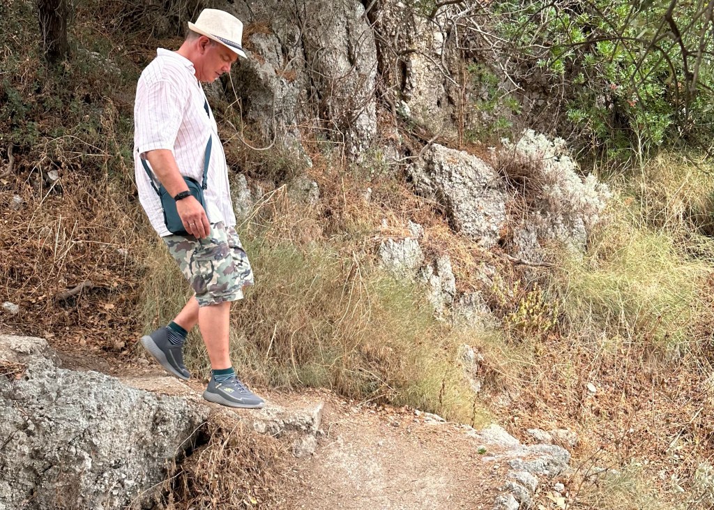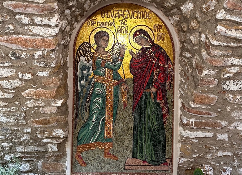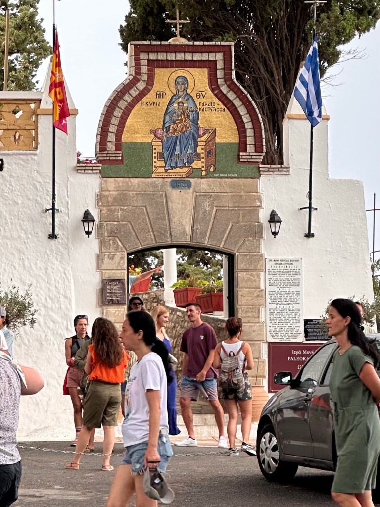Vandaag begon, na het douchen, de dag bewolkt en met lichte regen. Het is maar goed dat we per vandaag een auto voor een paar dagen hebben gehuurd. Na het ontbijt hebben we de benodigde papieren getekend en werd ons de autosleutel overhandigd. Een tripje naar het klooster Panagía Theotókou tis Paleokastritsa stond op de agenda. Een rit van ruim een uur door de bergen van Corfu. Na veel haarspeldbochten en momenten dat we net niet in een file stonden, maar meer onderdeel waren van een verkeerspolonaise, kwamen we in de buurt van het klooster. Daar hebben we de auto geparkeerd en zijn wandelend via de toeristische trekpleister van Paleokastritsa, de diverse mooie kiezelbaaien, naar het huis voor religieuzen gegaan.