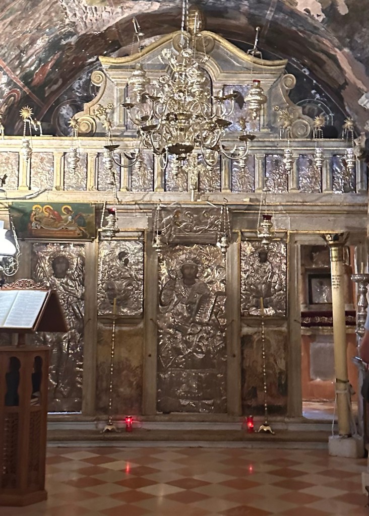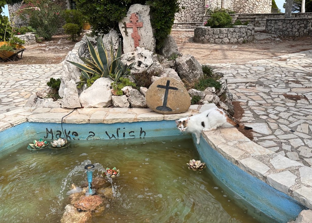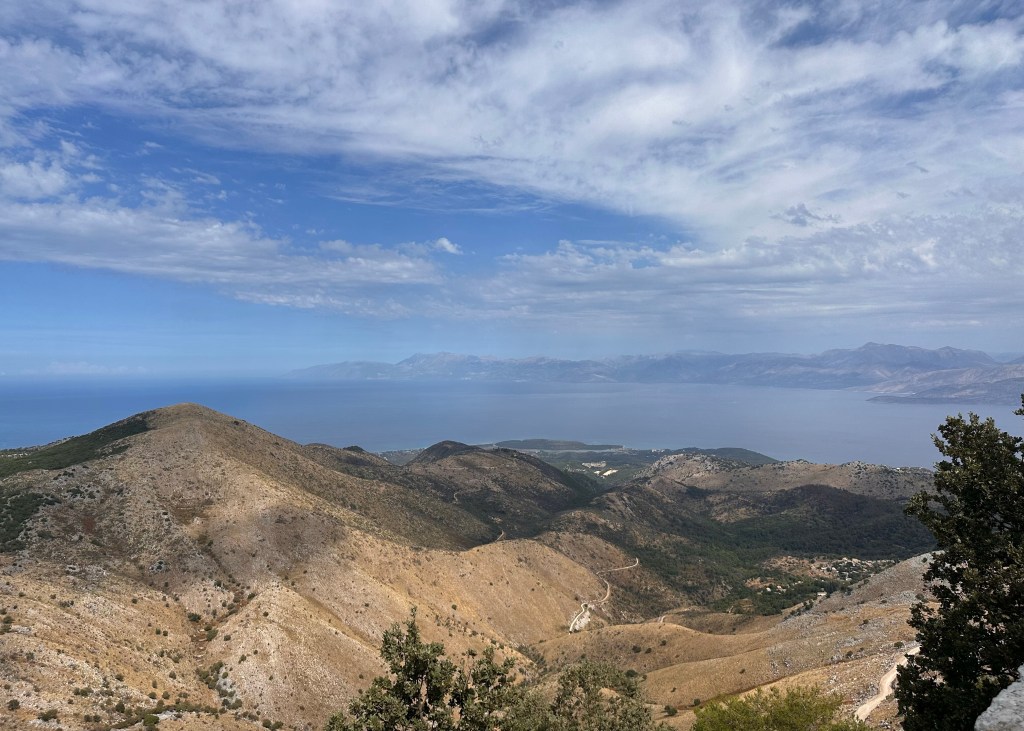 De Pantokrator staat er als een oude heer die weigert aan de kant te gaan. Altijd zichtbaar, zelfs als je dat niet wilt. Via een onverharde route klommen we naar de top. Bovenaan bevindt zich, het laat zich raden, een klooster. Niet groot, niet indrukwekkend zoals kerken dat in reisgidsen plegen te zijn, maar je hebt er uitzicht over alles: de zee die er schittert, Albanië dat dichtbij lijkt maar tegelijk ongenaakbaar, en Corfu zelf, een lappendeken van olijfbomen en stoffige weggetjes.