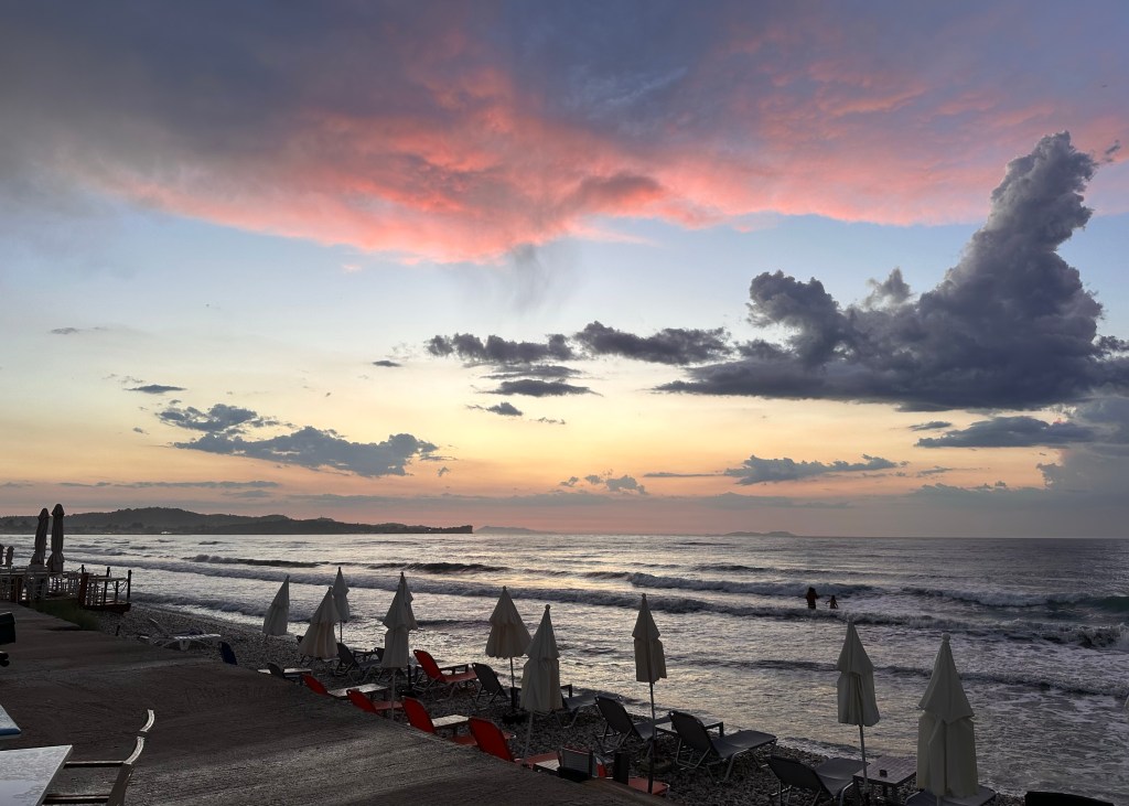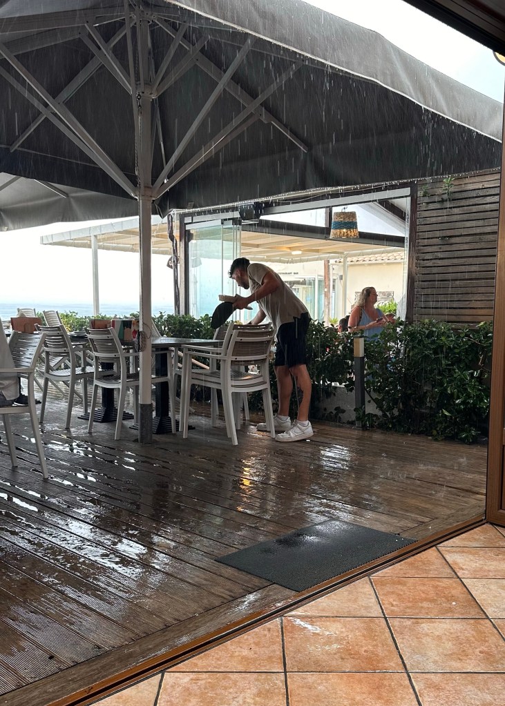 Aan het einde van de middag wandelden we terug en gingen nog even bij het zwembad relaxen, waarna we ons thuis opgeknapt hebben voor het avondeten. Online had ik een aardig restaurant, Faros, gevonden met goede recensies. We zijn er met de auto heengegaan, en net toen we geparkeerd hadden, begon het te regenen. Dikke druppels, en in de verte hoorde je het al onweren. Toen we eenmaal bij het restaurant waren, brak het los: een wolkbreuk. Alle gasten moesten het overdekte terras verlaten, want de regen stroomde langs de parasols over de tafels.