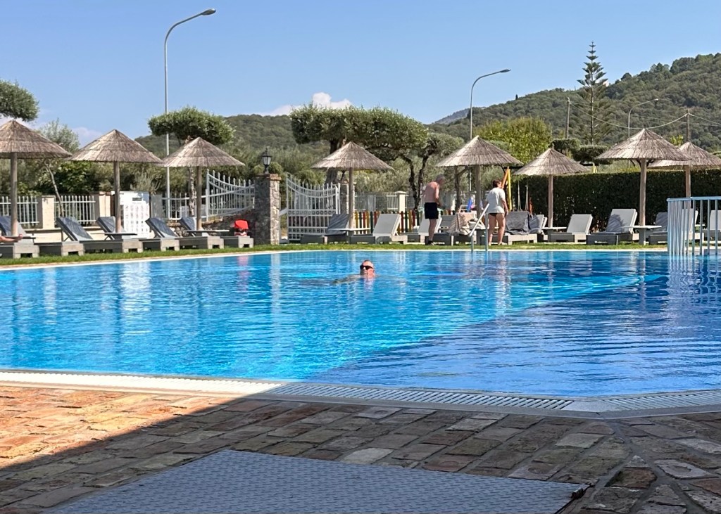 Na deze teleurstelling stapten we weer in de auto en reden we opnieuw naar het naaktstrandje. Dit keer dus niet te voet (je huurt zo’n auto niet voor niets) en dat scheelde ons blaren en blessures, die we gisteren wel hadden opgelopen op het kiezelstrand. Op het strandje was het rustiger dan gistermiddag en bleven we wat langer liggen. Maar de aanhoudende hitte dreef ons uiteindelijk terug naar de huurauto en daarna naar het zwembad van onze accommodatie. Ons tijdelijke thuis.