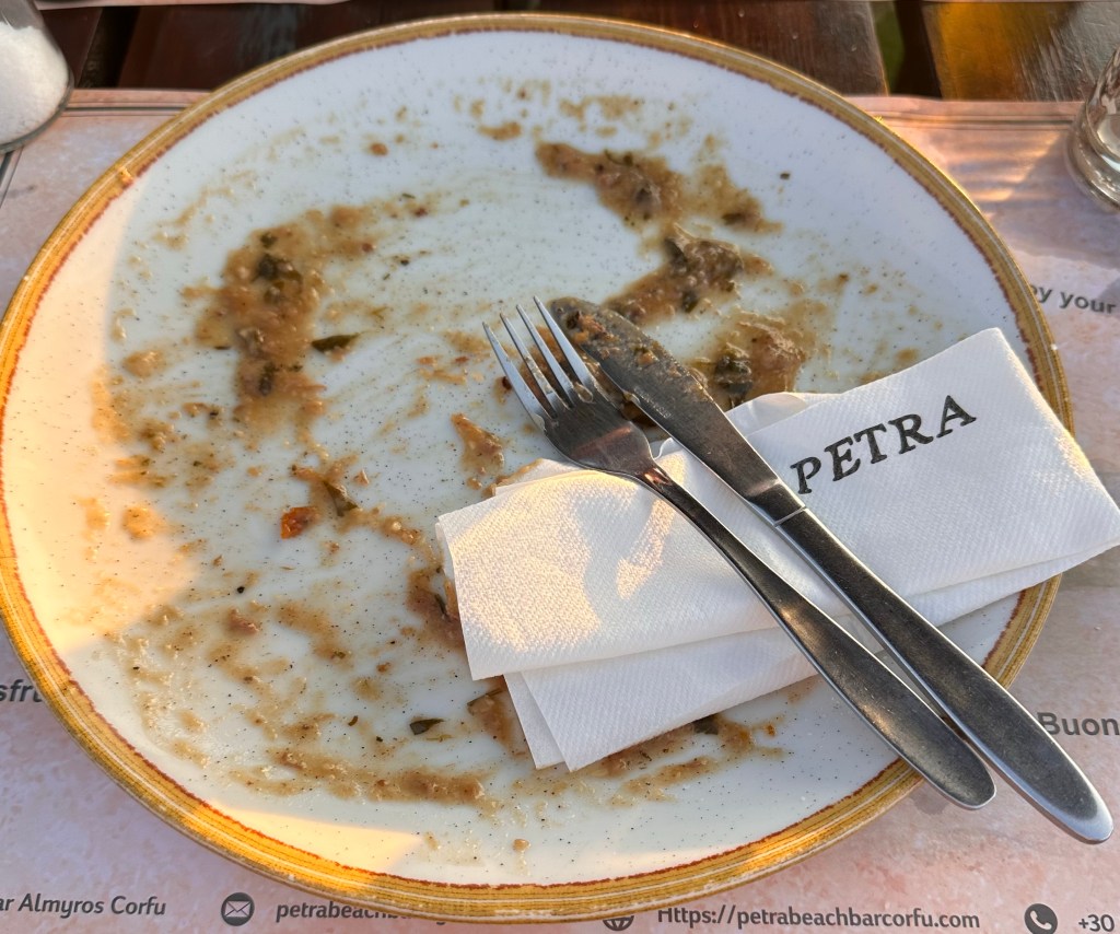 In de avond zijn we, net als afgelopen maandagavond, naar Petra Beach Bar gewandeld. Ook dit keer koos ik hetzelfde als de vorige keer. Ik noem het een ingeboren voorkeur. Maar de tirosalade en de Sofrito zijn ook gewoon een vakantietraktatie. Dus waarom anders doen? Aangenaam detail: dit keer waren er geen muskieten.