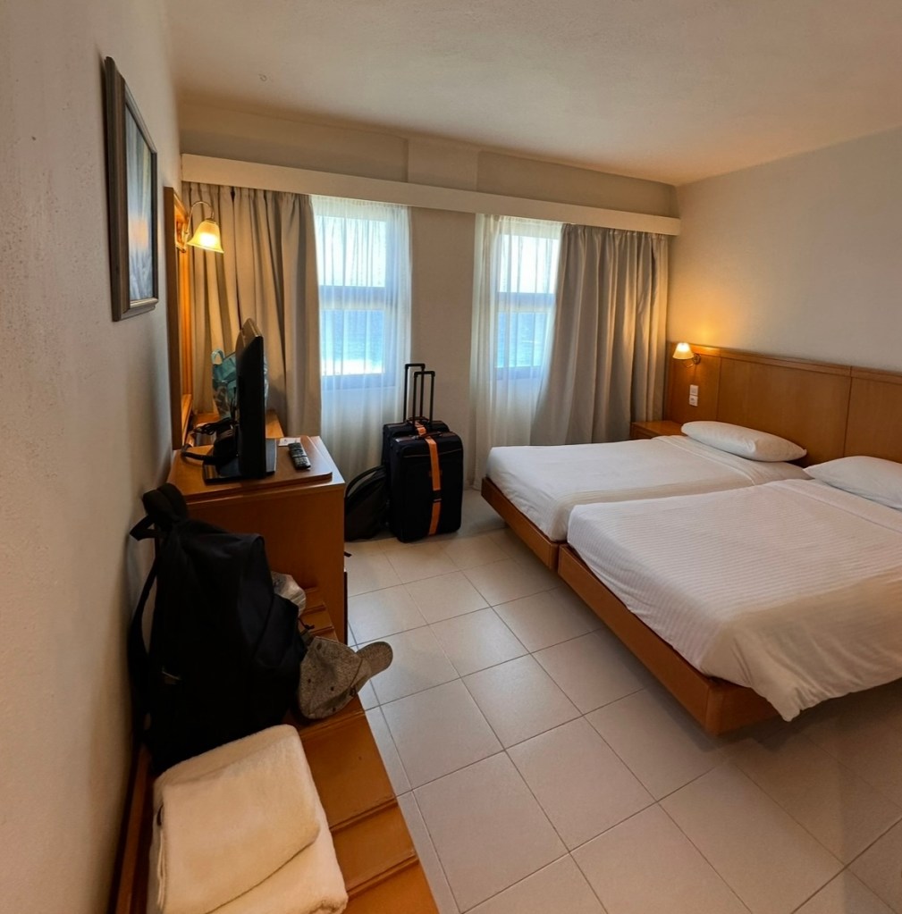 Even voor het middaguur dan toch uitgecheckt en weer ingecheckt voor de andere kamer. Dit was een echte down-grade. Geen balkon, maar één stopcontact en de grootte van de kamer was een kwart van onze eerdere kamer op de vijfde etage. Het was voldoende om de komende zes uur uit te houden.